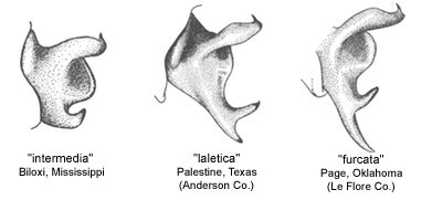 The drawings labeled "laletica" and "furcata" are from populations that Hebard