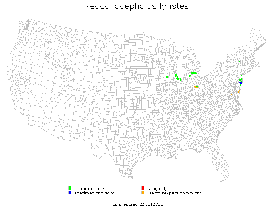 The record from Giles County, Virginia is from Tim Forrest whose students at Mountain Lake Biological Station found a population along the New River in July 2019. No shading is added between it and the already known populations. It might be added that the coneheads of Ohio are well enough known to make it likely that its populations in four counties in southern Ohio are isolated from those farther north-TJW.