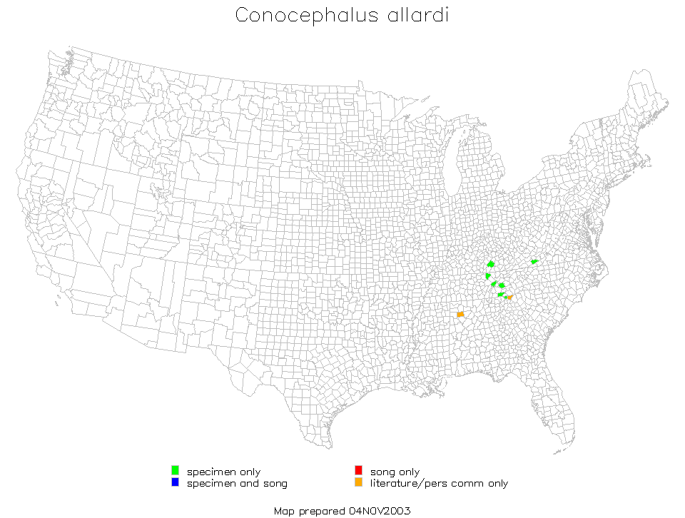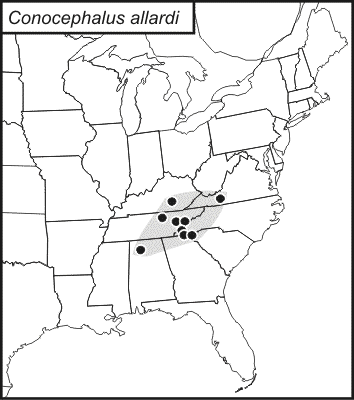 Conocephalus allardi is found in the Southeast Region of the United States, centrally located around Alabama, Georgia, Kentucky, North Carolina, Tennessee, and Virginia.