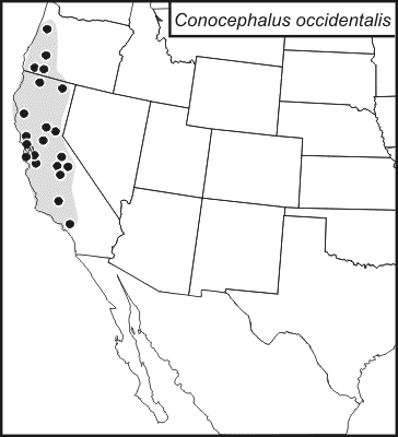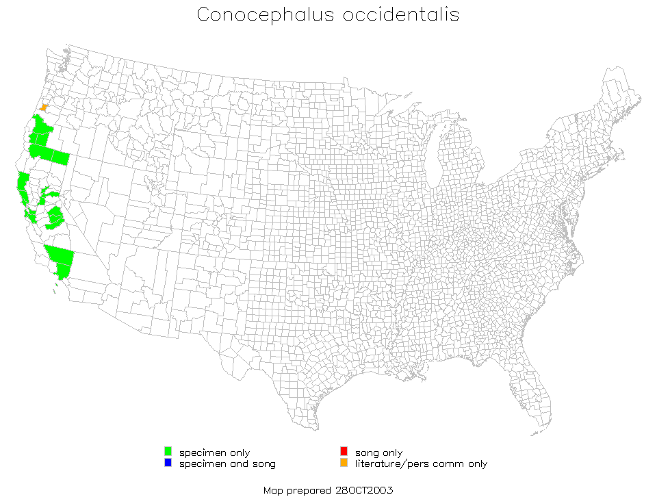 Conocephalus occidentalis is found throughout California and on the west side of Oregon.