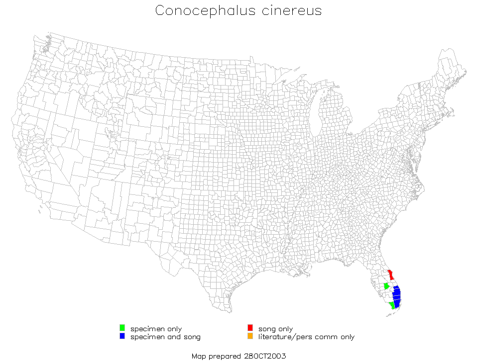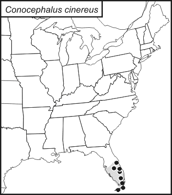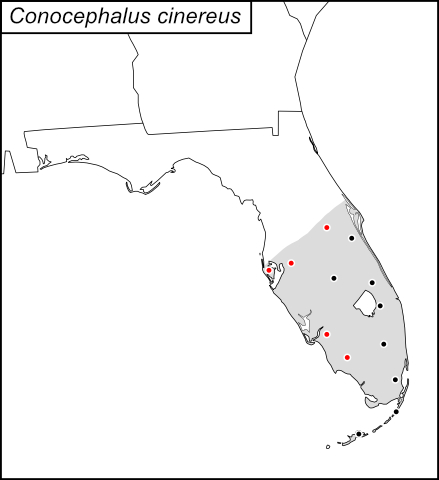 Conocephalus cinereus is found in Central and South Florida.