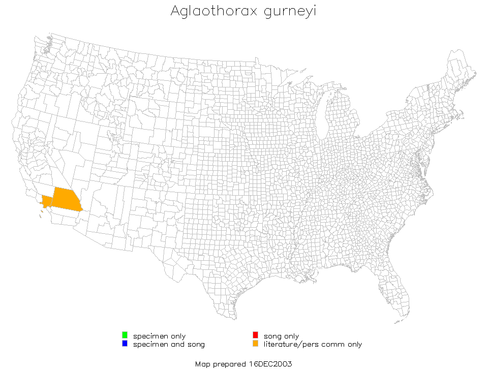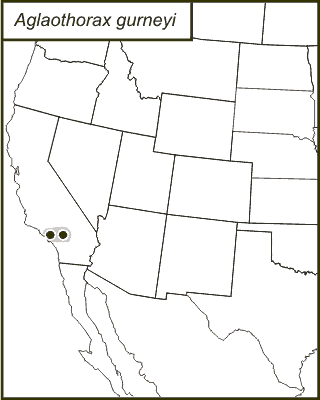Aglaothorax gurneyi is found in the San Bernardino and San Gabriel Mountains of the Transverse Ranges of Southern California.