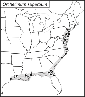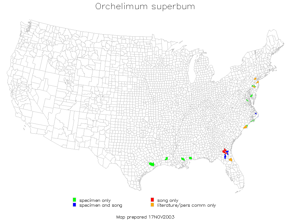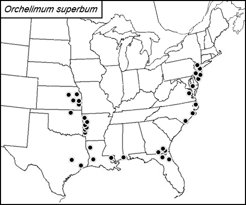 Orchelimum superbum is found in the Midwest (Kansas), Southwest (Oklahoma and Texas), Southeast (Arkansas, Florida, Georgia, Louisiana, Mississippi, North Carolina, and Virginia), and Northeast (Maryland, New Jersey, and Pennsylvania) Regions of the United States.