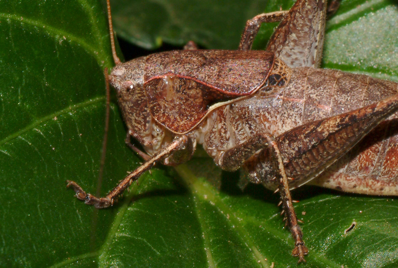 Close-up showing tips of forewings protruding from beneath male's pronotum; Buncombe County, North Carolina.