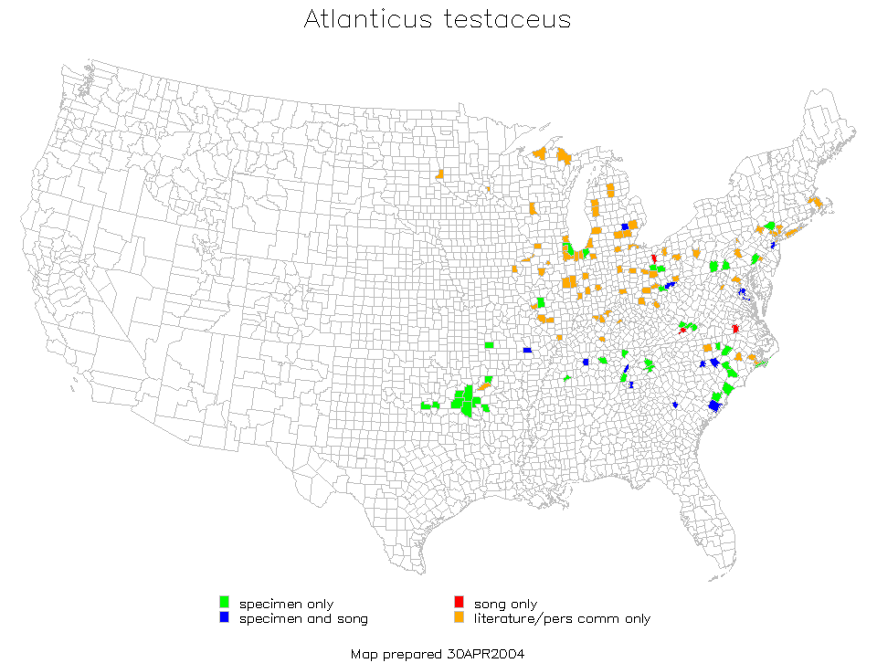 Dots show county records; shaded area shows likely general distribution.