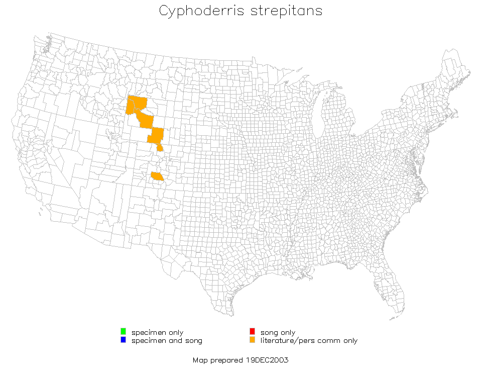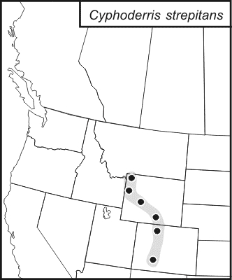 Cyphoderris strepitans is found in the West Region of the United States, in Wyoming and Colorado.