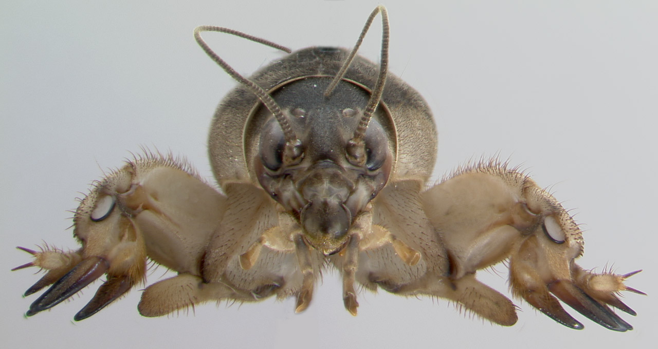 Because of the viewing angle, the tibial dactyls on the mole cricket's left foreleg appear closer at their bases than they actually are.