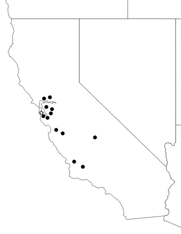 Dots show county records; shaded area shows likely general distribution.
