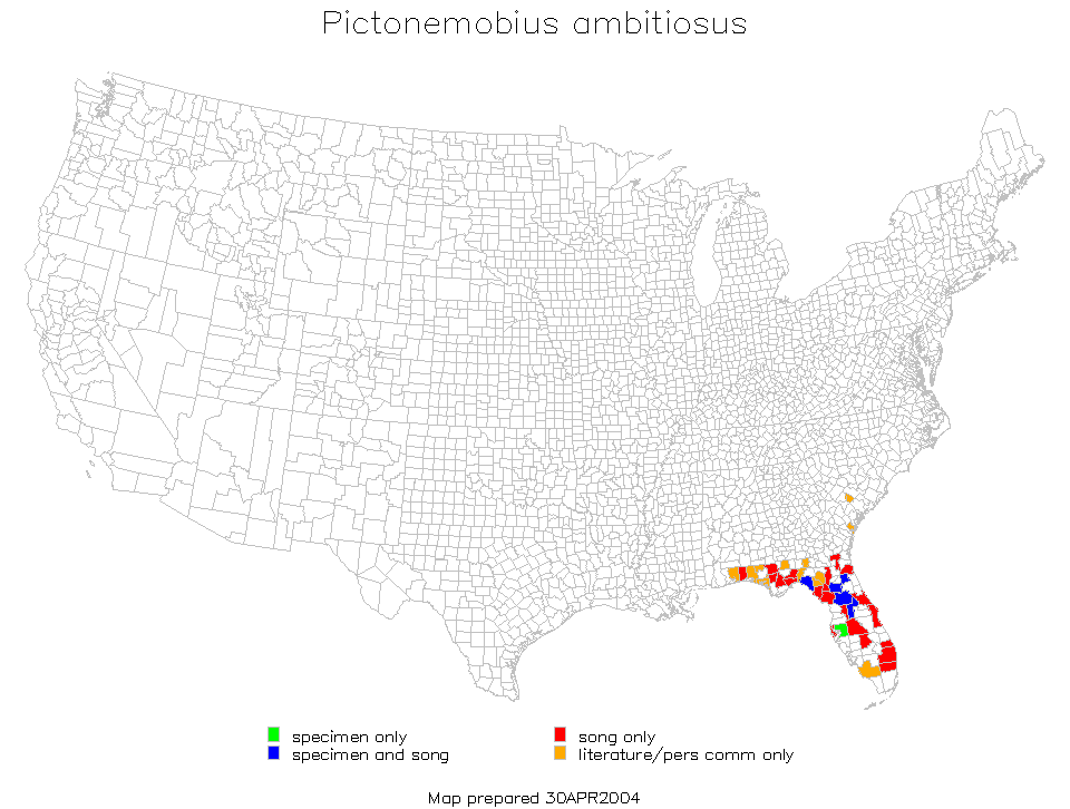 Dots show county records based on tape-recorded males; shaded area shows likely general distribution.