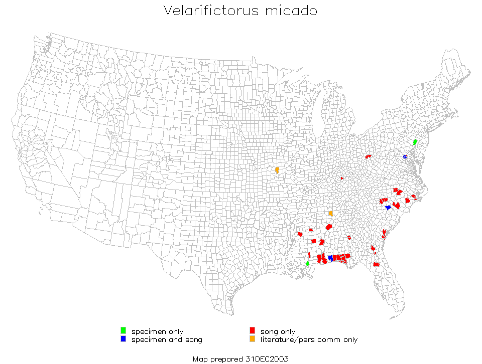 The Columbia, Missouri, record is based on a song recorded by Vince Marshall, Sep.-Oct. 2000. The north-most Indiana record is from a 29 Dec 2014 email from Carl Strang, who recognized that it was far north of where V. micado had been found before. Because the species was in large numbers in a disturbed area, he thought that "they almost certainly have been building their numbers over at least a couple of years, demonstrating their abilities to survive our winters." The New York record is from a 20 Sep 2017 email from Brandon Woo in which he reported finding several individuals of this species on the Cornell campus. This range extension is similar to previous ones in that the species was found in a landscaped area rather than a natural habitat. The Boston record, also from Woo, was of males audiorecorded in a city park, similar to other reports of this species from urban sites.