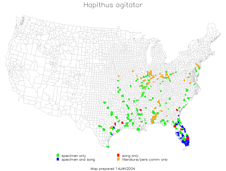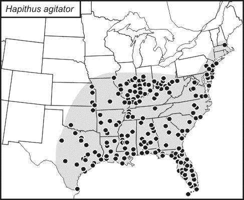 Hapithus agitator's range extends across the Southeast region of the United States and reaches eastward into the Southwest and northward into the Midwest and Northeast regions.