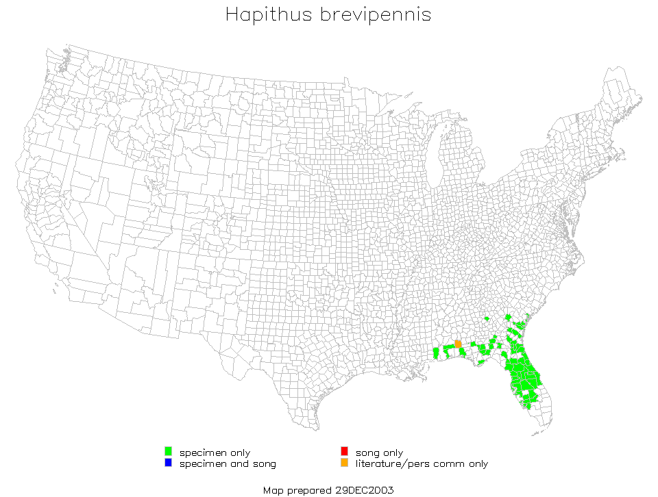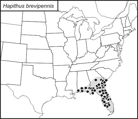 Hapithus brevipennis is found throughout Florida, except in the most southern counties, along the southern border of Alabama, south to central Georgia, and one county in South Carolina.