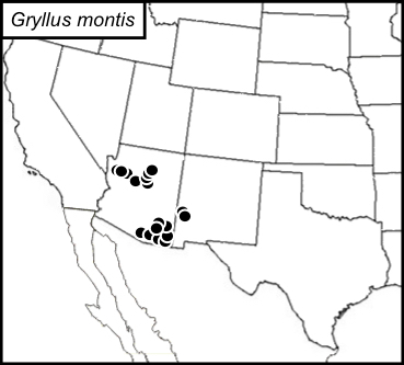 Gryllus montis is found throughout Arizona and in Catron County, New Mexico.