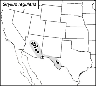 Gryllus regularis is found in central-southeastern Arizona, southwestern New Mexico, and western Texas.