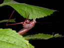Scudderia eggs are extraordinarily thin and flat--as befits the fact that the female inserts them between the upper and lower epidermal layers of leaves! The female's oviposition technique is easily observed. Deprive a fertilized female of suitable oviposition sites for a day or so and then transfer her to the leaves of most any plant. She will usually begin to lay in a few minutes. Here is a sequence of photographs that shows a "pink" female of S. furcata, from Rapides Parish, Louisiana, ovipositing in the paper-thin leaves of beautyberry (Callicarpa americana).