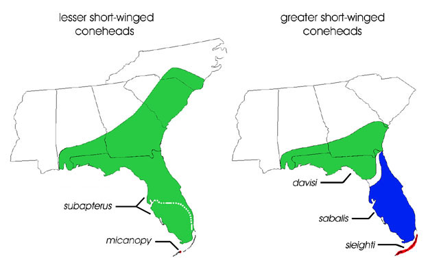 The populations of short-winged coneheads (Belocephalus) fall readily into two species groups: greater short-winged coneheads, represented by sabalis, davisi, and sleighti, and lesser short-winged coneheads, represented by subapterus and micanopy. No locality has more than two populations of Belocephalus, and, wherever two occur, one belongs to each group.