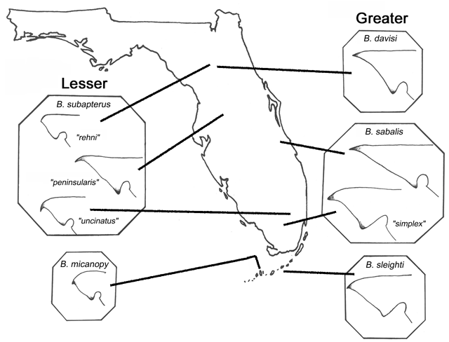 RemarksShort-winged coneheads cannot fly nor do they have other means of long-range dispersal. Morphological differences that developed when once continuous populations were fragmented by Pleistocene changes in sea level may still remain even though populations are again continuous. For example, over a distance of about ten miles just north of Frostproof, Florida, the subgenital plates of male B. subapterus change from the usual type to the "hebardi" type (see drawings on B. subapterus page). Specimens with intermediate-type plates occur here only in a narrow zone. Elsewhere the transition between the two types of plates has not been studied. (See the common true katydid for a more extensively studied similar case.)