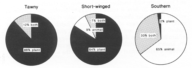 Feeding habits of pest mole crickets, indicated by examination of gut contents. Note that S. vicinus and S. abbreviatus (left and center) are mainly herbivorous, whereas S. borellii is mainly carnivorous.