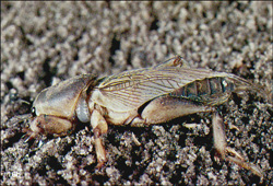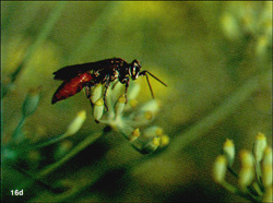 Fig. 16a-d. Larra bicolor, a digger wasp that parasitizes mole crickets. Fig. 16a. Female laying egg on temporarily paralyzed mole cricket. Fig. 16b. Young larva feeding ectoparasitically on active mole cricket host. Fig. 16c. Mature larva consuming remains of host. Fig. 16d. Female feeding on flowers. (Photos by J. L. Castner) |